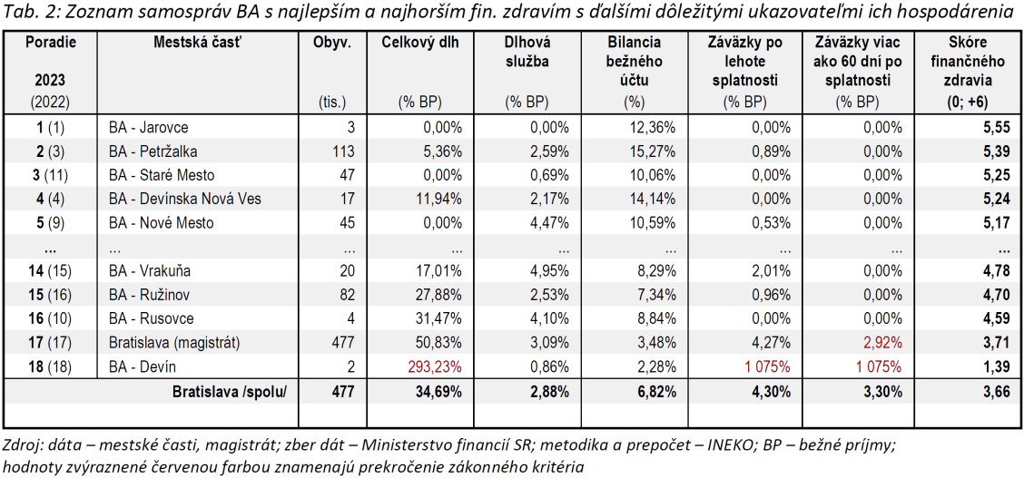 Pri Bratislave sa jedná o agregovaný údaj za celé mesto, teda magistrát a všetky mestské časti spolu. Ak by doňho nebola zahrnutá problémová mestská časť Devín s obrovským historickým dlhom a záväzkami po lehote splatnosti, ktorá bola roky v nútenej správe a aktuálne prechádza tzv. konsolidáciou pohľadávok, tak by celá Bratislava bola vo vyššom pásme – zhruba na úrovni priemeru všetkých miest. Celú Bratislavu však ťahá nadol aj jej magistrát, od ktorého sú pri posudzovaní finančného zdravia horšie už len Spišské Vlachy a spomínaný Devín.