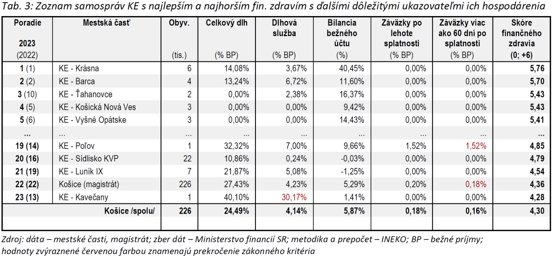 V Košiciach získali najlepšie hodnotenie mestské časti Krásna, Barca a Ťahanovce. Naopak, najnižšie skóre finančného zdravia evidujeme postupne pri Kavečanoch, košickom magistráte a pri časti Luník IX.