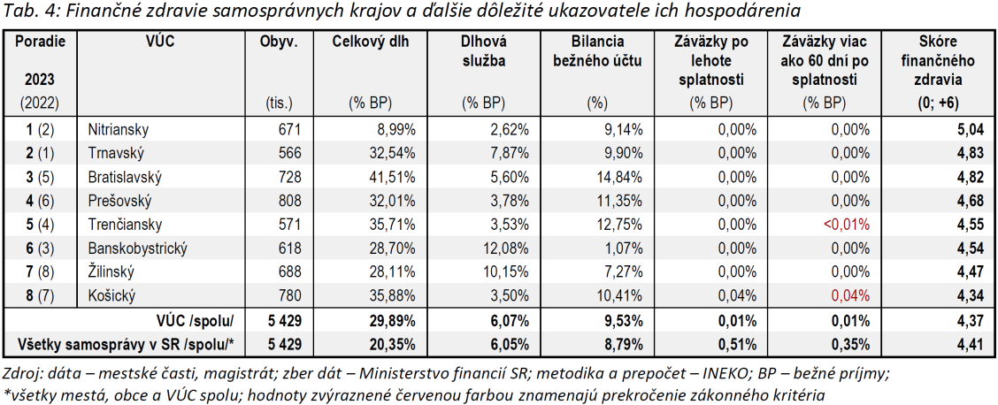 Žiadna spomedzi ôsmich žúp na Slovensku neprekročila zákonnú hranicu pre celkový dlh na úrovni 60 % z bežných príjmov a takisto ani prvé sankčné pásmo dlhovej brzdy pre samosprávy (50 %). Najvyšší dlh mali ku koncu roka 2023 v Bratislavskom samosprávnom kraji (41,5 %). Naopak, najlepší stav zaznamenali v nitrianskej župe (9,0 %). Dlh dokázali v roku 2023 najviac znížiť v žilinskom kraji (o vyše 7 %-uálnych bodov).